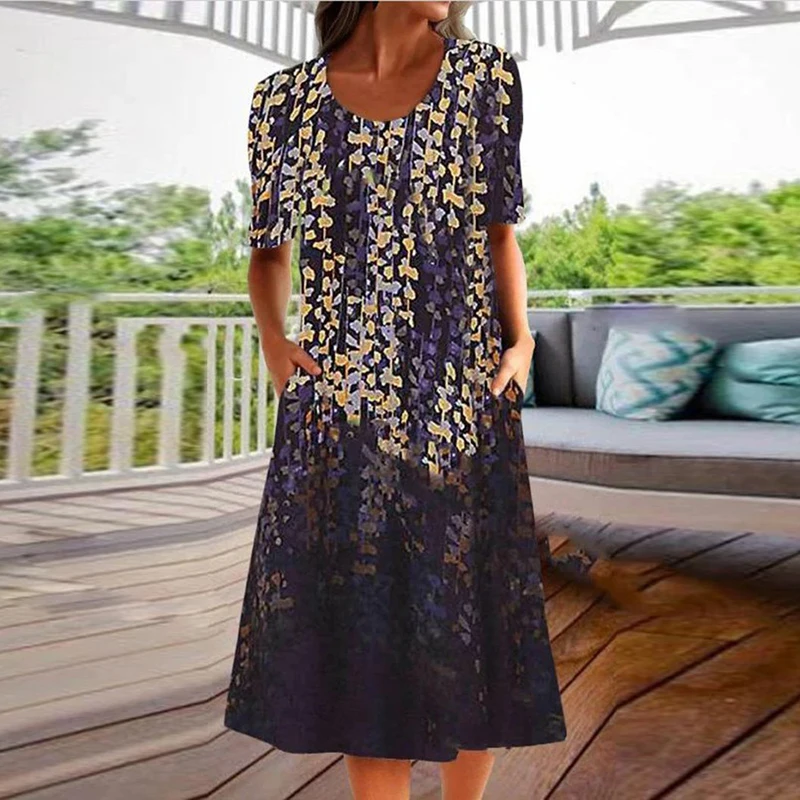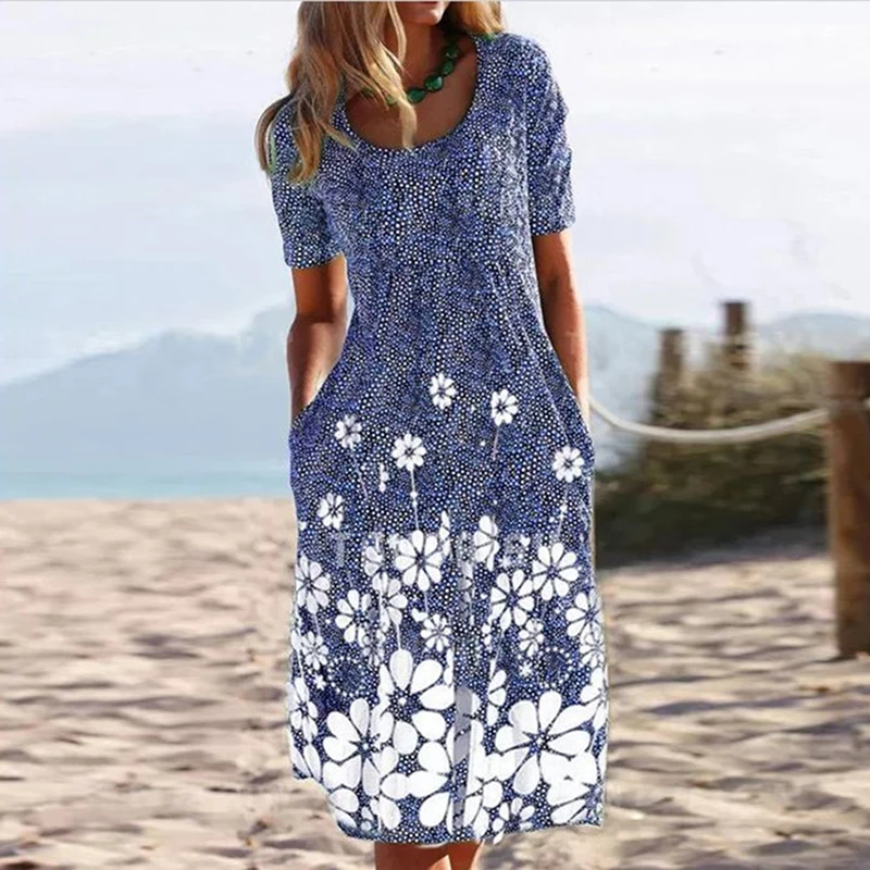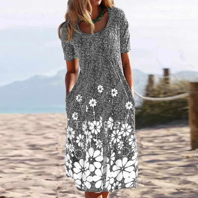 Women’s Plus Size Flower Printed Summer Dress with Pockets